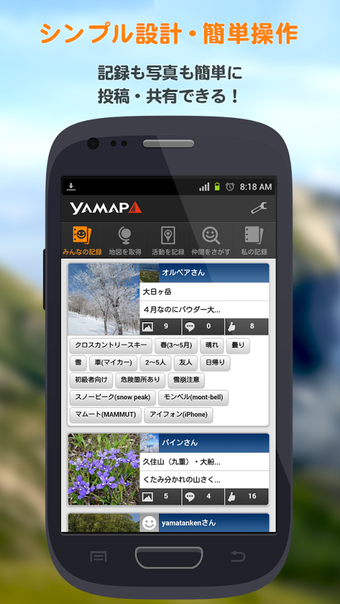 山登りが終わったら、これらの記録をYAMAP上にアップして、写真も追加して会員の人たちと共有できます。YAMAPは山好きが集まったコミュニティなので、お互いにコメントしあえるほか、他の会員が登った山の記録を見て、次の登山の計画を立てるのも良いですね。