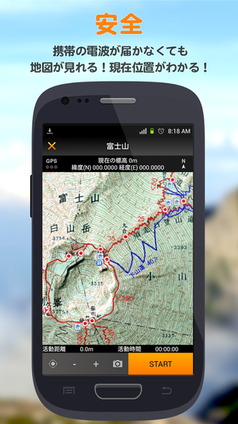 お目当ての山の地図をダウンロードしたら、山へGO! 歩きはじめるときにYAMAPを起動し、「活動を記録する」ボタンにタップして記録をスタート。地図上にオレンジのボールで現在位置が表示されます。地図上の移動ルートだけでなく標高・距離も記録されます。